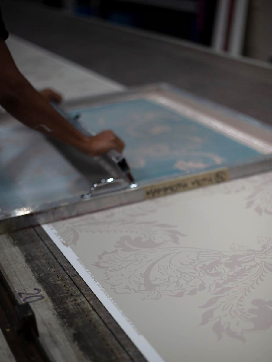 Our papers are handprinted to order using water-based, environmentally safe inks on a PVC-free, FSC-certified non-woven base. Each roll is hand trimmed and supplied ready to be hung.