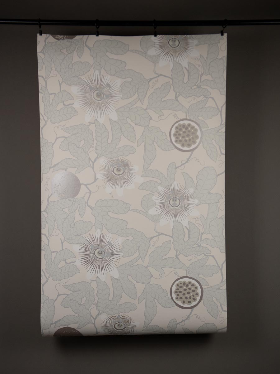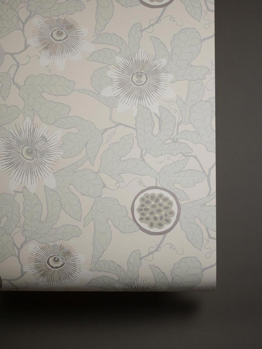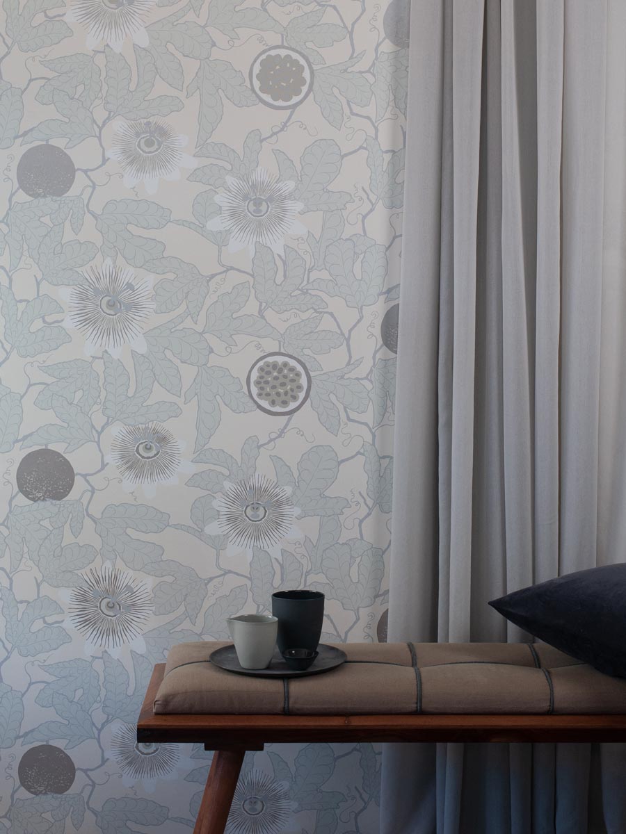 Passionflower is a rich, bold print that turns any wall into a scene as decadent as it is dynamic. This stunning 5 colour design, depicting a passionfruit vine in full bloom is Mark’s first wallpaper design to be drawn entirely digitally. Traditionally when designing a wallpaper print Mark will draw or paint most of the elements by hand, then use programs such as illustrator to then bring them together into a balanced repeating pattern. Printed in cool soft greys and shimmering dark silver as part of the C.M.G loves Publisher range, collaboration between Claire Granville and Publisher.