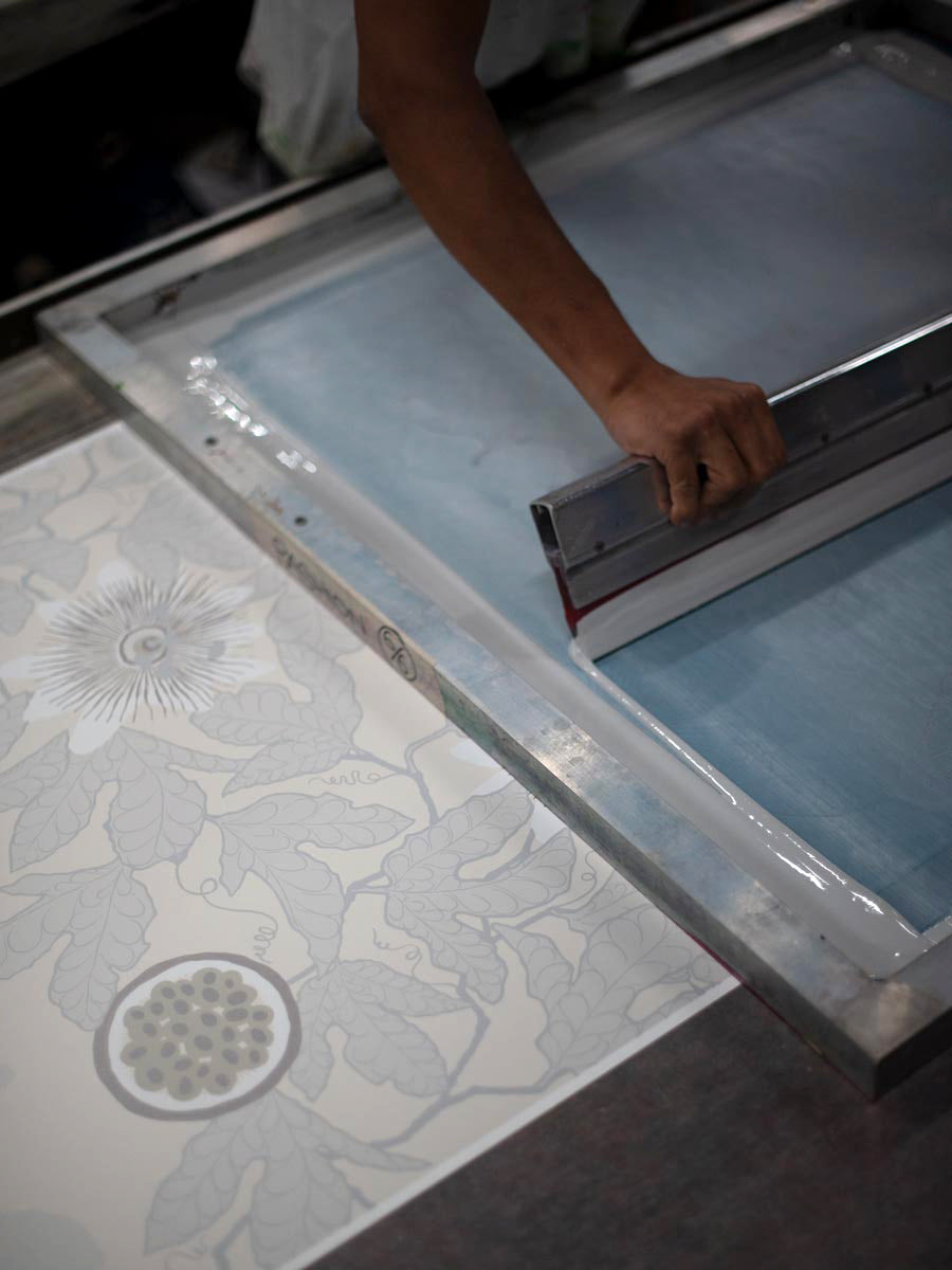 Our papers are handprinted to order using water-based, environmentally safe inks on a PVC-free, FSC-certified non-woven base. Each roll is hand trimmed and supplied ready to be hung.
