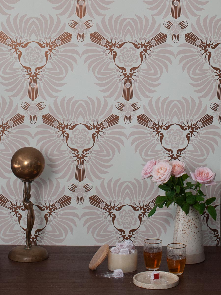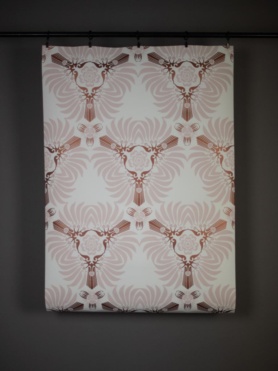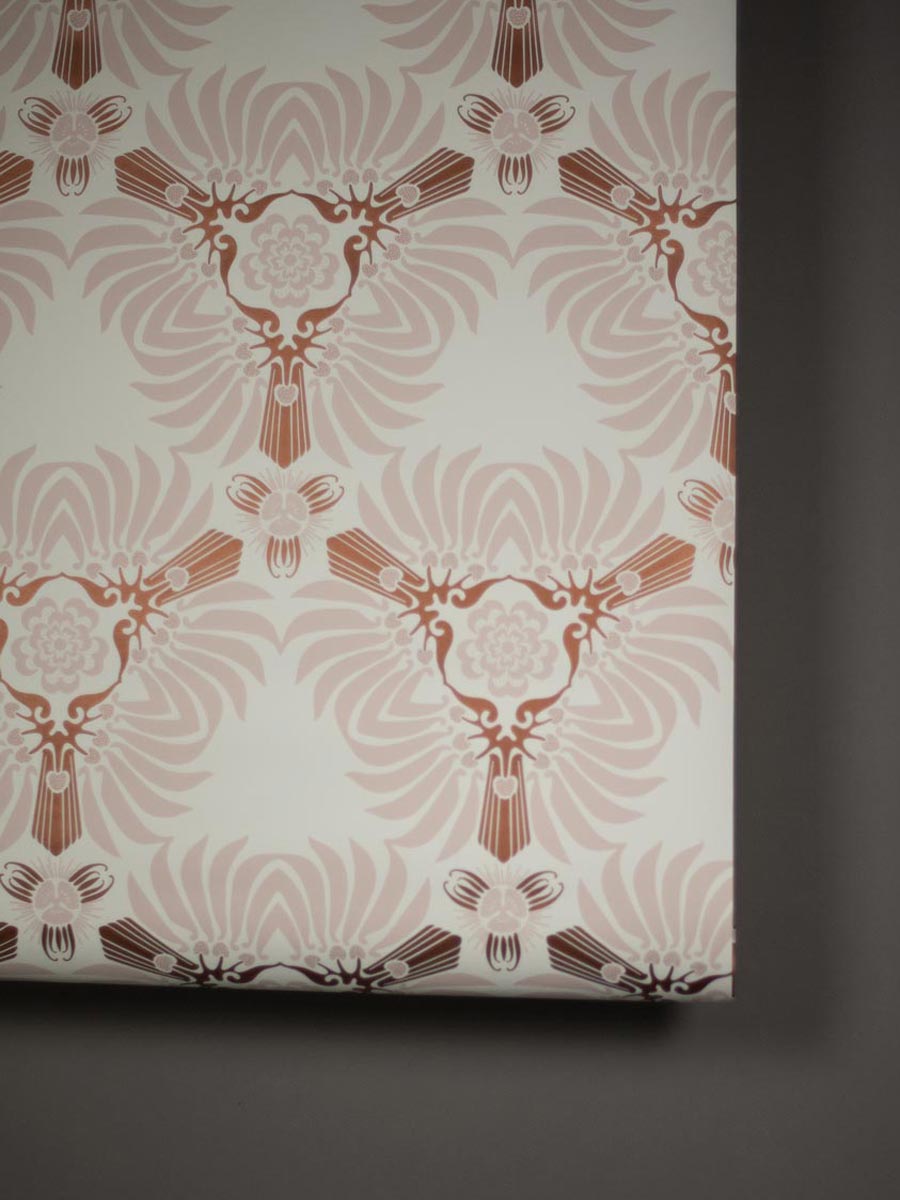 This kaleidoscopic print was designed in house by Mark Cawood. Abstracted from traditional English Art Nouveau stencils, this design is both floral and crest-like. Printed in cool white, soft pale mauve and shimmering copper as part of the C.M.G loves Publisher range, collaboration between Claire Granville and Publisher.