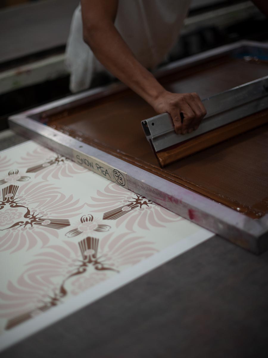 Our papers are handprinted to order using water-based, environmentally safe inks on a PVC-free, FSC-certified non-woven base. Each roll is hand trimmed and supplied ready to be hung.