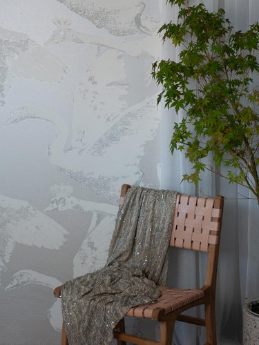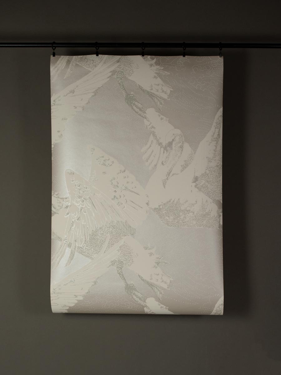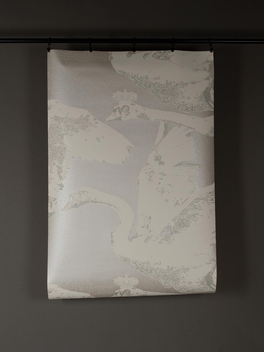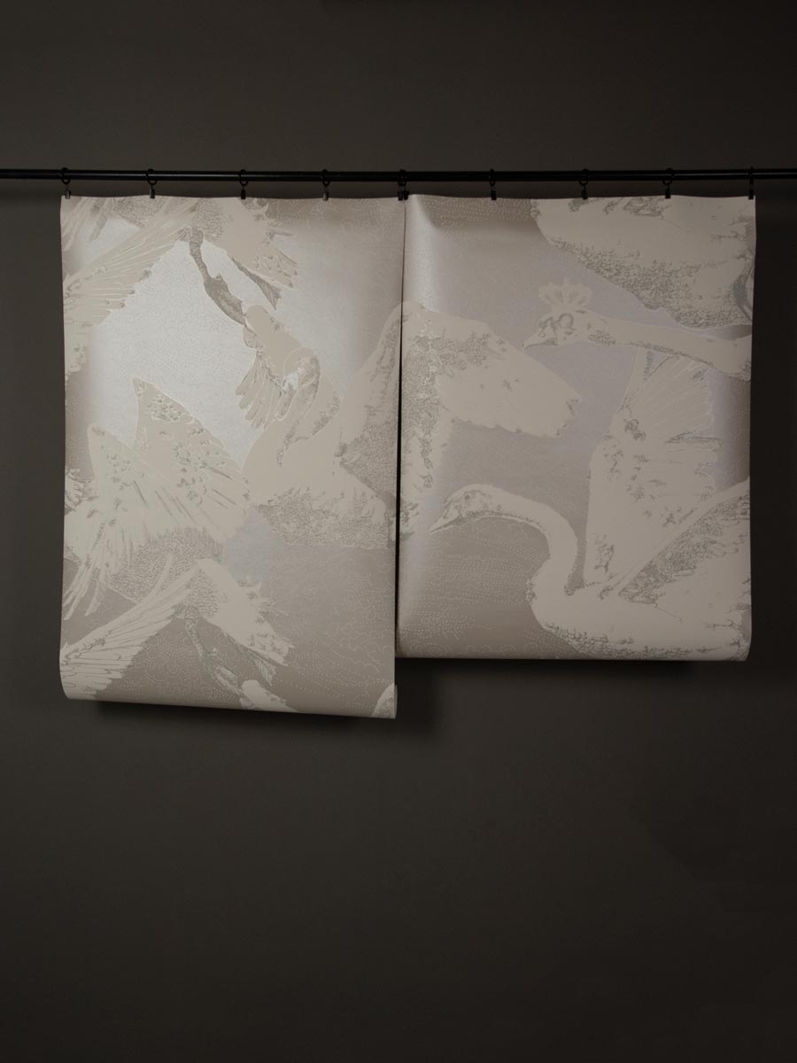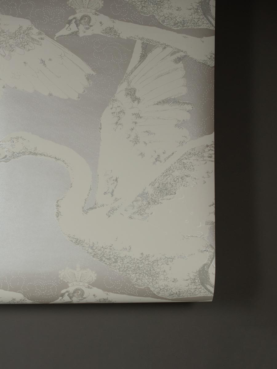 Inspired by German fairy tales and Greek mythology, this decorative wallpaper by Mark Cawood features a flock of swans in different stages of flight. These fantasy swans have a regal quality with tiny crowns perched upon their heads. Printed in shimmering white gold and warm white with soft grey highlights as part of the C.M.G loves Publisher range, collaboration between Claire Granville and Publisher.