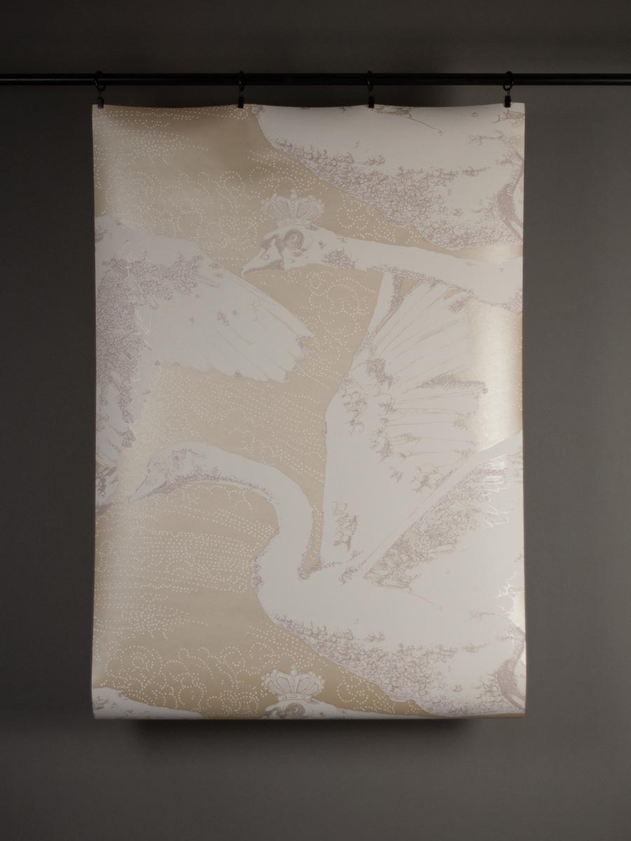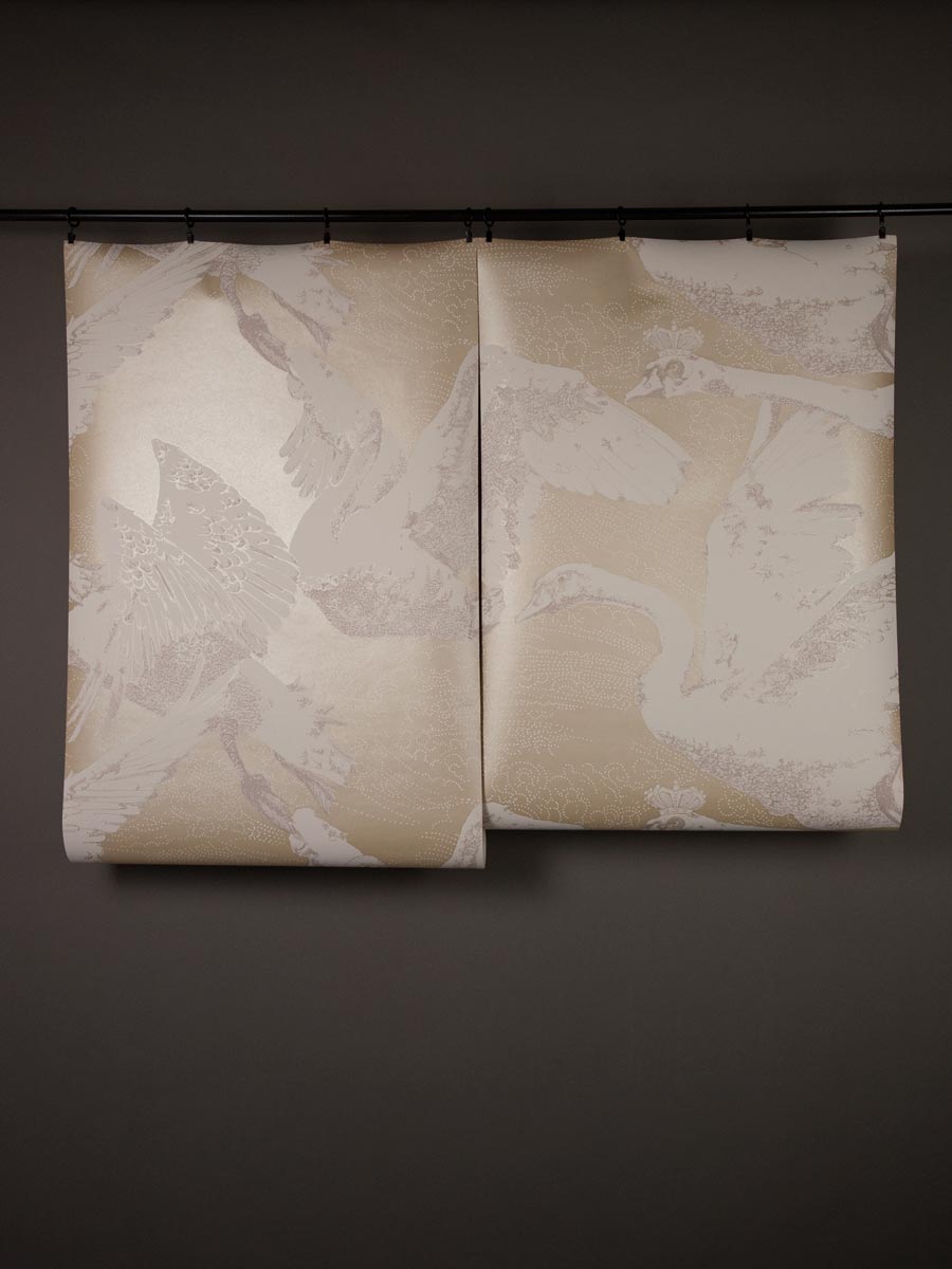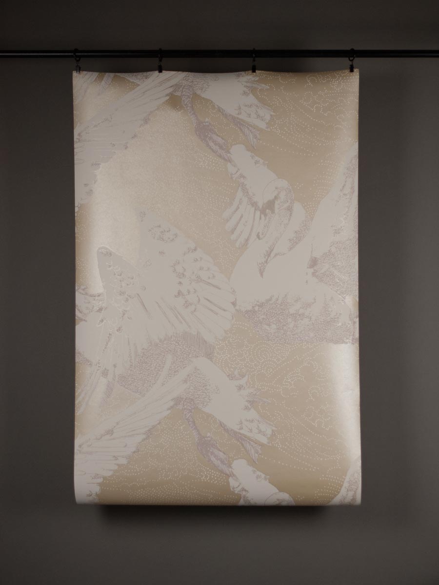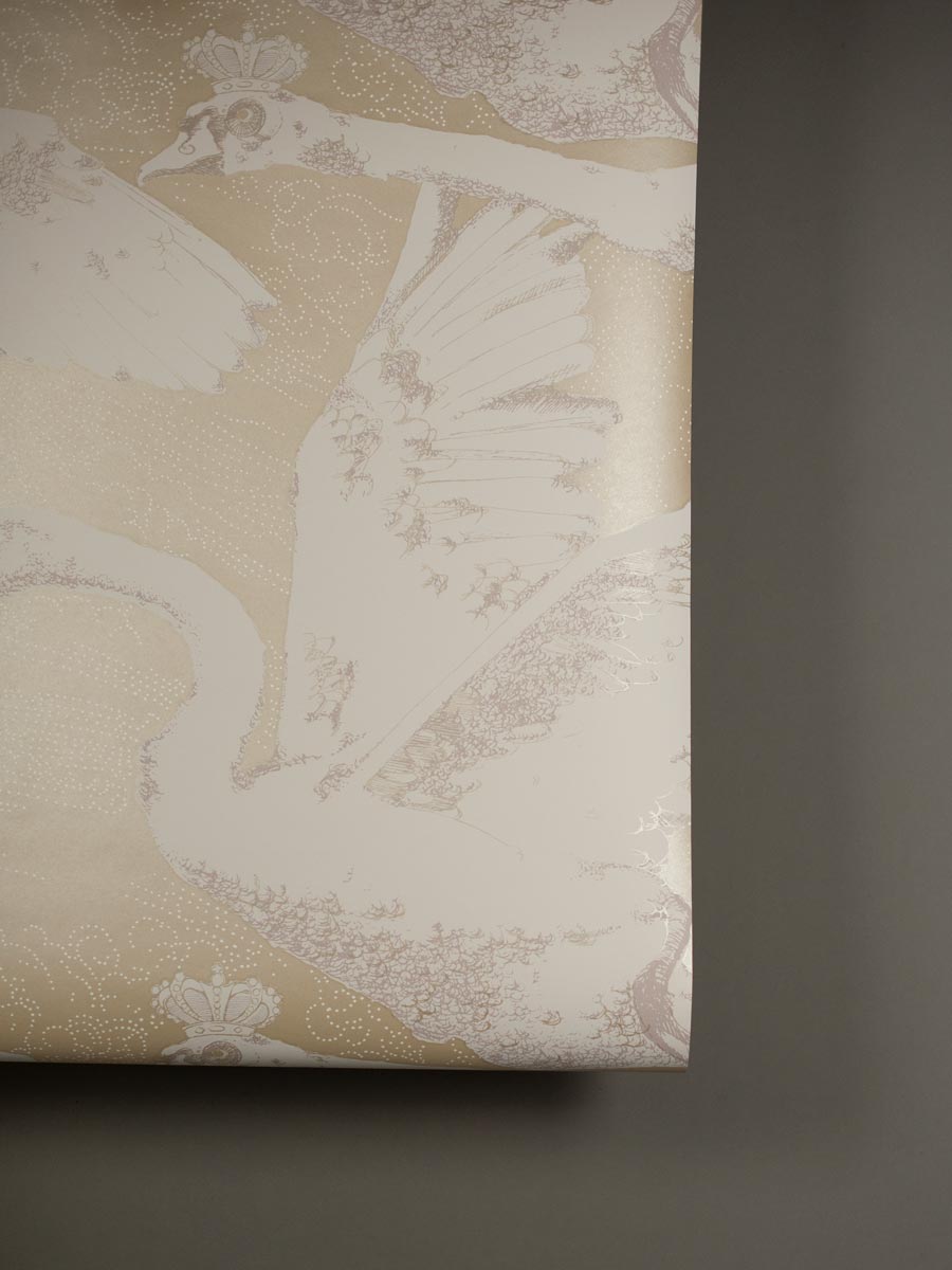 Inspired by German fairy tales and Greek mythology, this decorative wallpaper by Mark Cawood features a flock of swans in different stages of flight. These fantasy swans have a regal quality with tiny crowns perched upon their heads. Printed in shimmering gold and warm white with soft pale mauve highlights as part of the C.M.G loves Publisher range, collaboration between Claire Granville and Publisher.