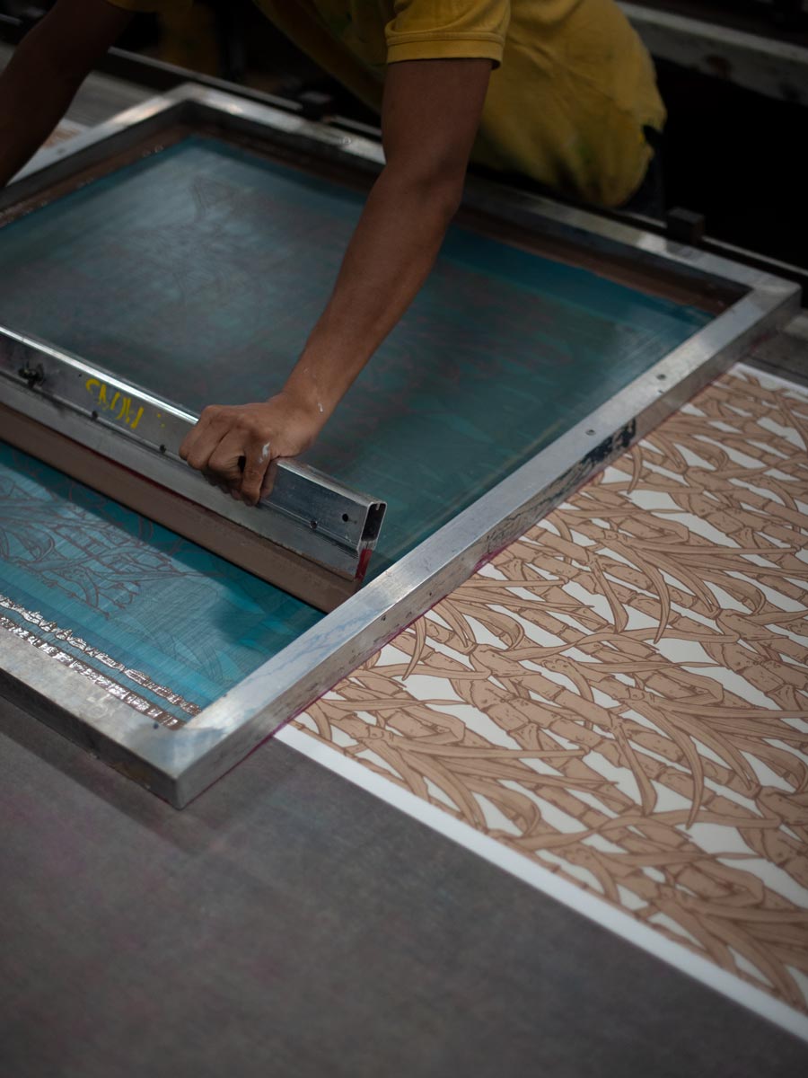 Our papers are handprinted to order using water-based, environmentally safe inks on a PVC-free, FSC-certified non-woven base. Each roll is hand trimmed and supplied ready to be hung.