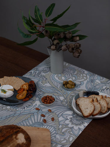Elevate your table with our handmade Ruby Rabbit table runner in soft blues and greys on 100% linen. Hand printed and sewn in house with love in Sydney.