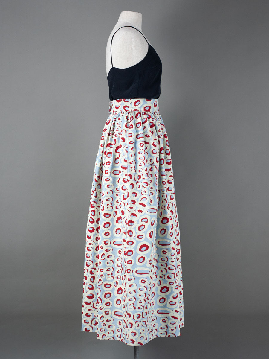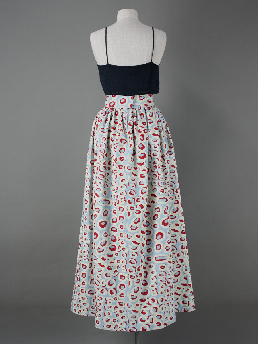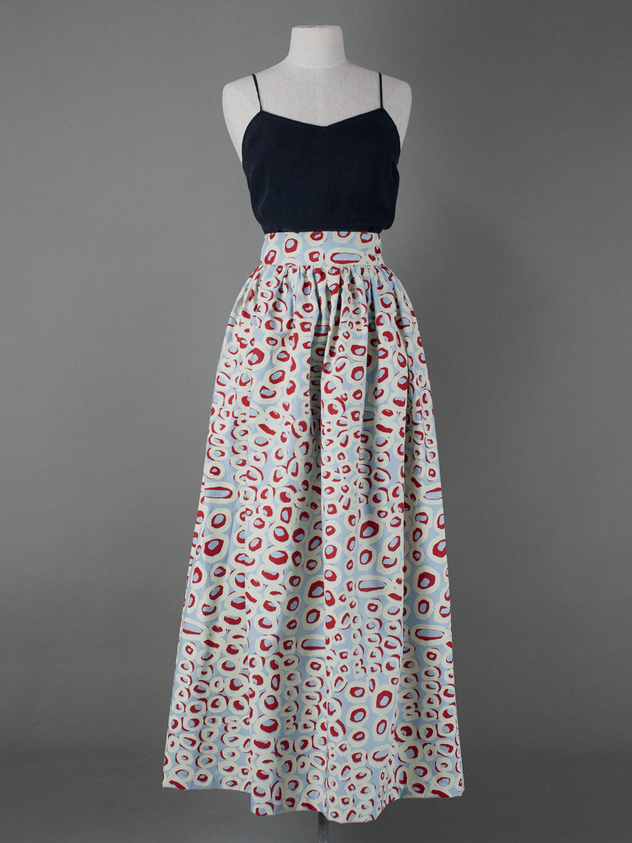 Classic high waisted full maxi skirt with wide waist band, hook and eye closure and zip at back. Designed, printed, cut and sewn in house as a one-off garment, using end roll fabrics, keeping more textiles out of landfill.