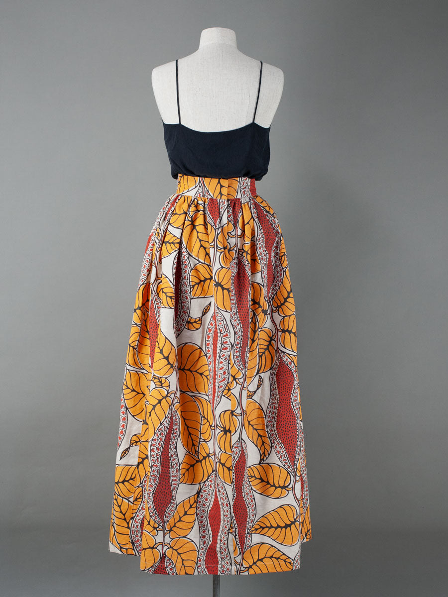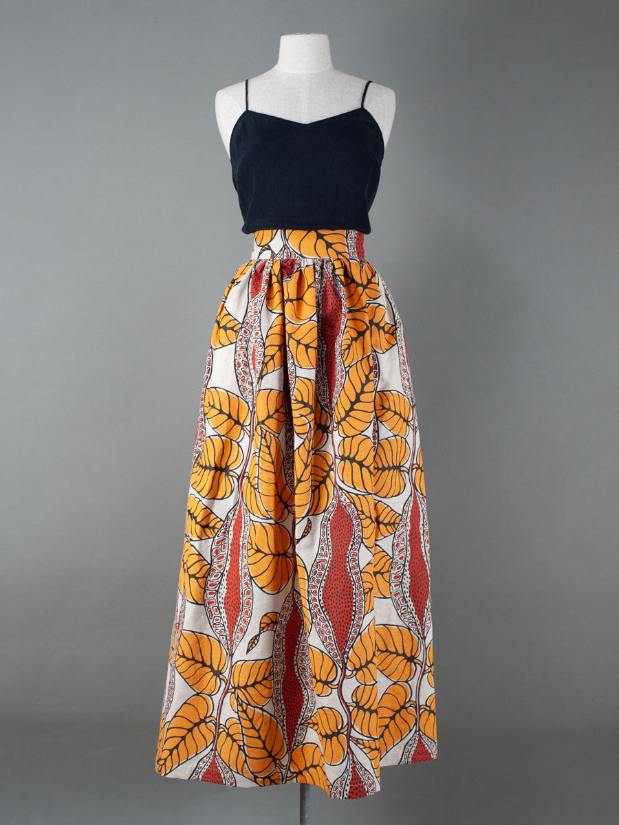 Classic high waisted full maxi skirt with wide waist band, hook and eye closure and zip at back. Designed, printed, cut and sewn in house as a one-off garment, using end roll fabrics, keeping more textiles out of landfill.