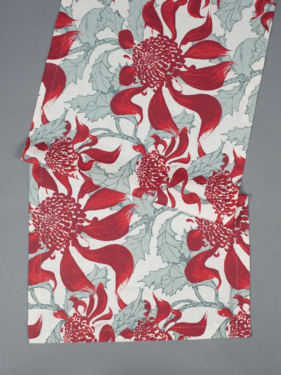 Elevate your table with our handmade Waratah table runner in cherry red on natural 100% linen. Hand printed and sewn in house with love in Sydney.