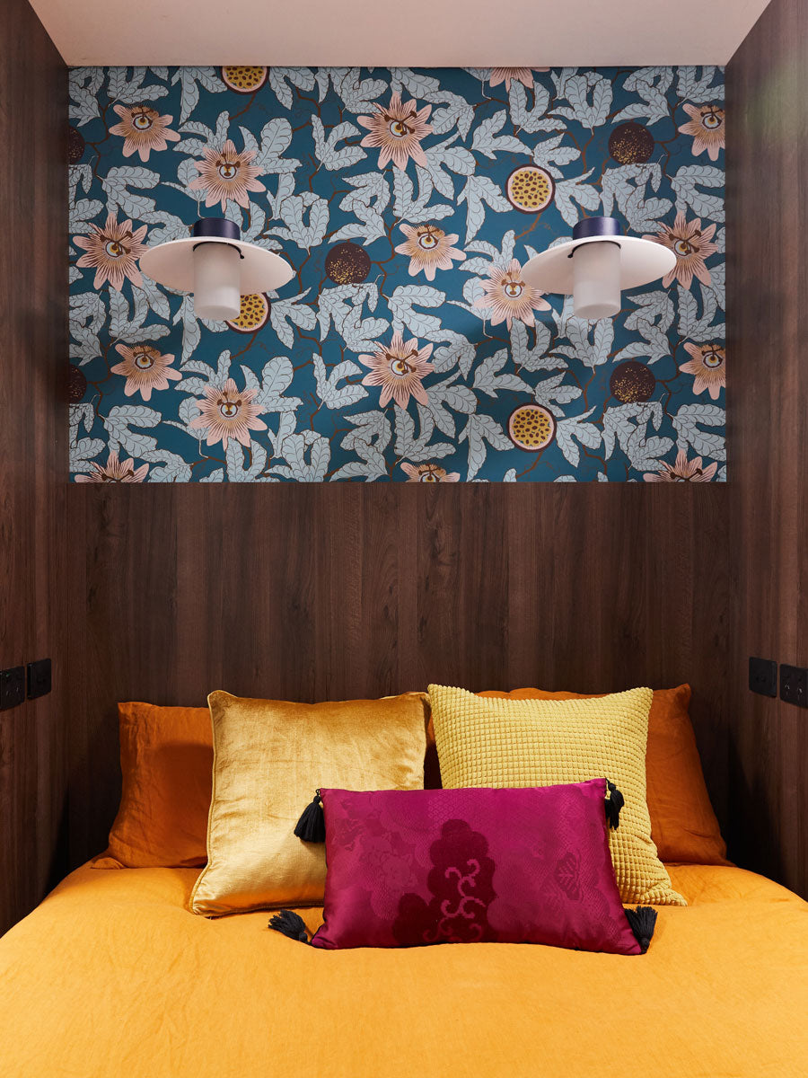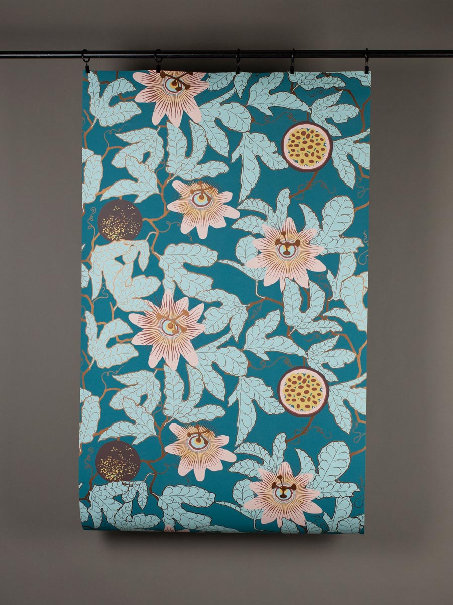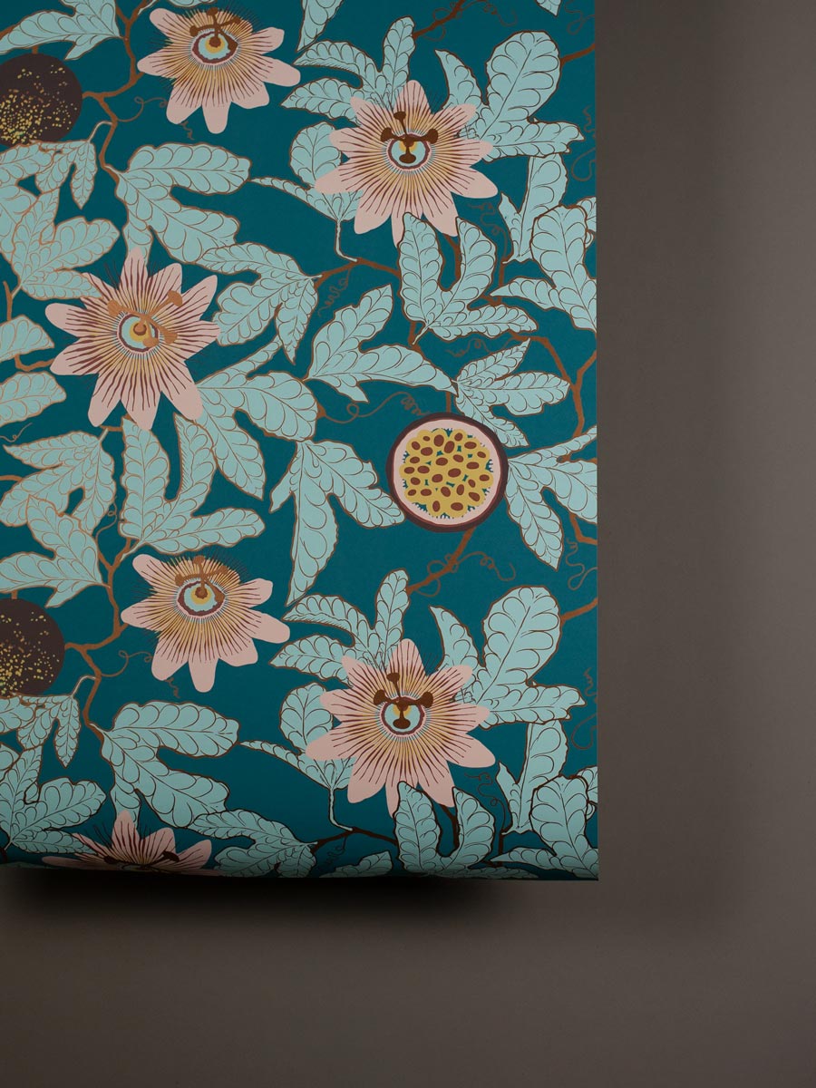 Passionflower is a rich, bold print that turns any wall into a scene as decadent as it is dynamic. This stunning 5 colour design, depicting a passionfruit vine in full bloom is Mark’s first wallpaper design to be drawn entirely digitally. Traditionally when designing a wallpaper print Mark will draw or paint most of the elements by hand, then use programs such as illustrator to then bring them together into a balanced repeating pattern.
