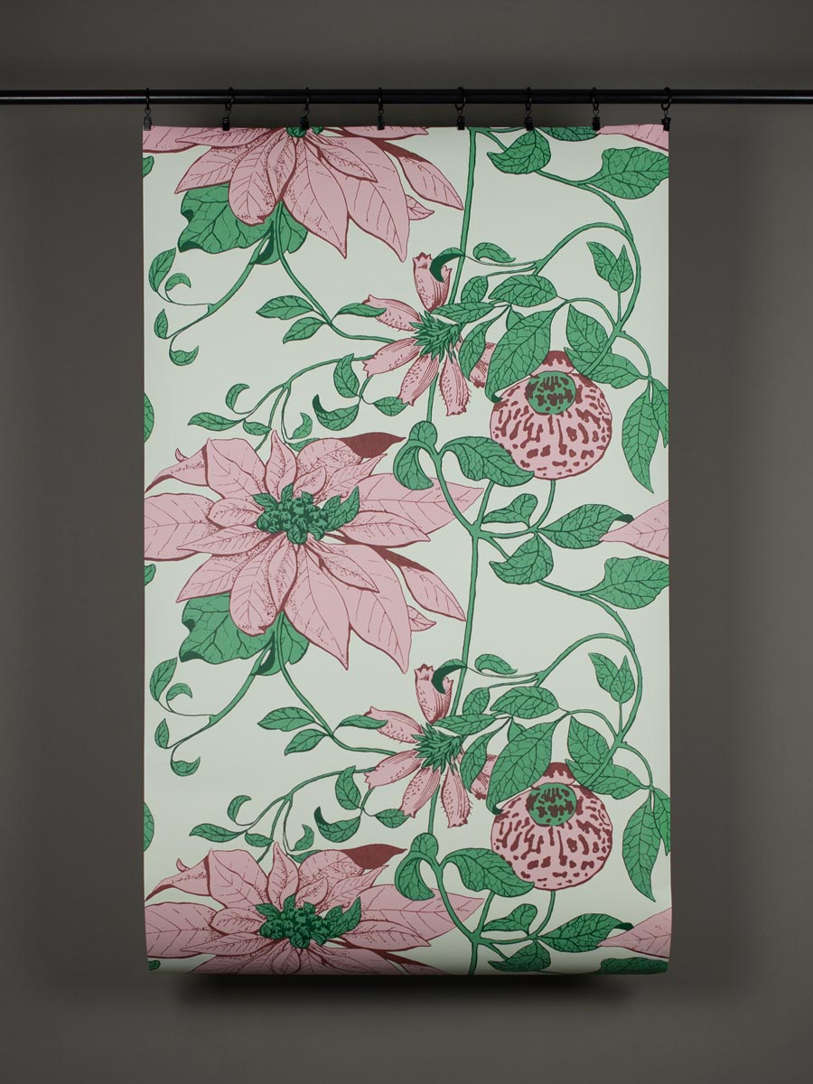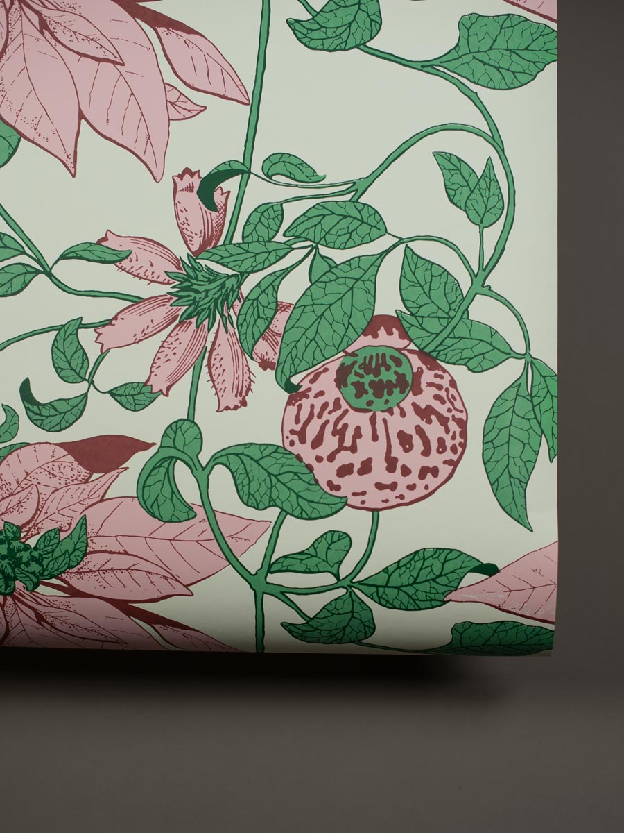 This fluid botanical wallpaper print features giant poinsettia flowers flanked by large climbing leaves. Printed in deep greens with bold pink flowers.