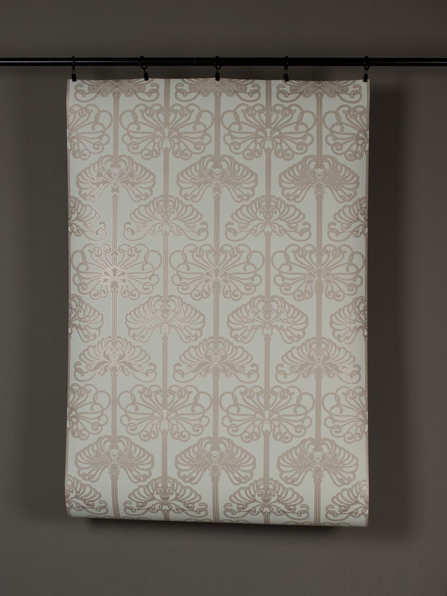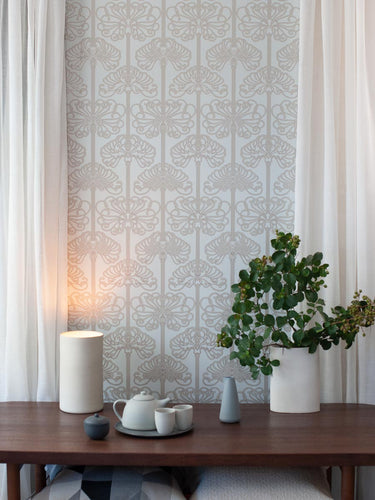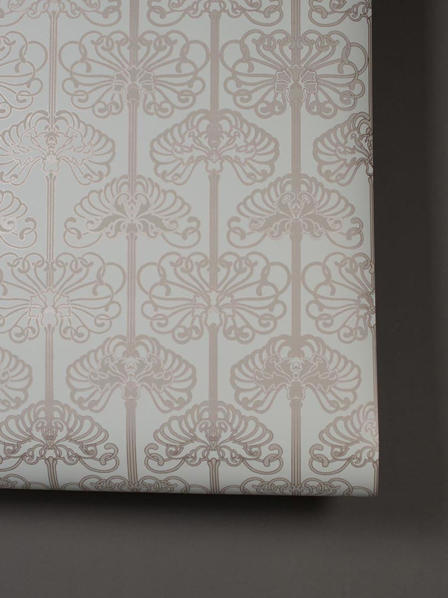 This original Art Deco wallpaper print was designed in house by Mark Cawood. It features flowing curvilinear forms connected by sharply defined lines, creating a feeling of movement reminiscent of the ornate carousels of the 1920s. Printed in the soft cool greys and shimmering silver as part of the C.M.G loves Publisher range, collaboration between Claire Granville and Publisher.