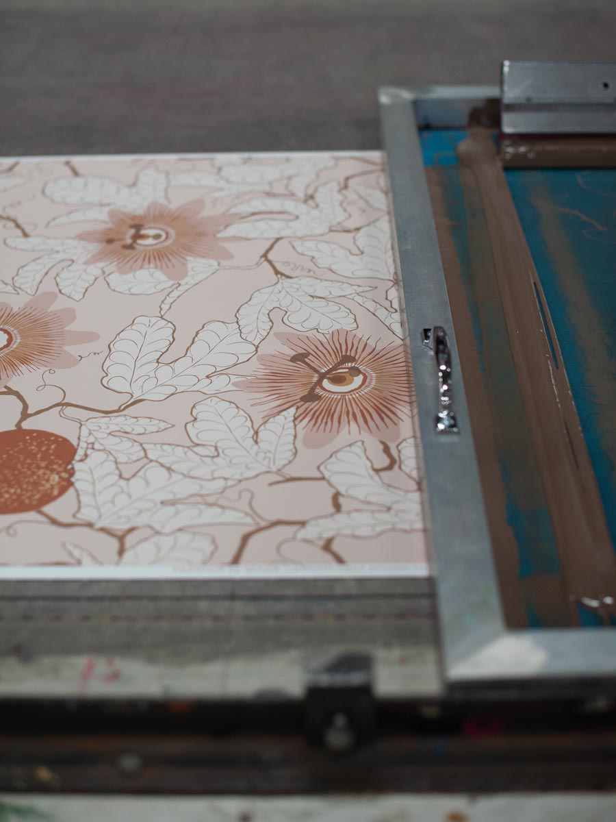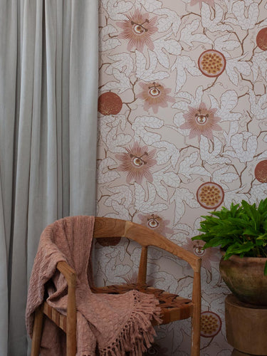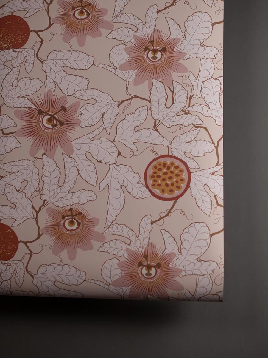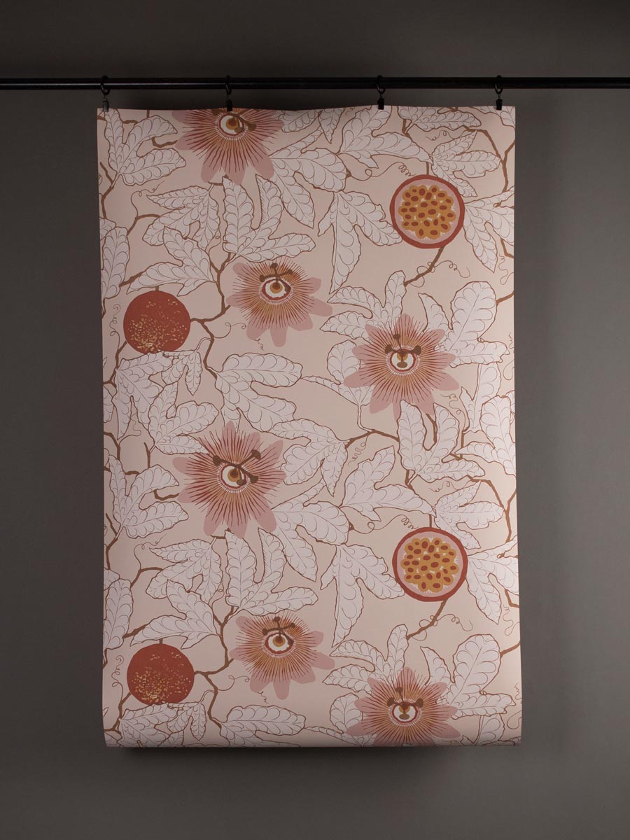 Passionflower is a rich, bold print that turns any wall into a scene as decadent as it is dynamic. This stunning 5 colour design, depicting a passionfruit vine in full bloom is Mark’s first wallpaper design to be drawn entirely digitally. Traditionally when designing a wallpaper print Mark will draw or paint most of the elements by hand, then use programs such as illustrator to then bring them together into a balanced repeating pattern. Printed in warm autumnal tones as part of the C.M.G loves Publisher range, collaboration between Claire Granville and Publisher.