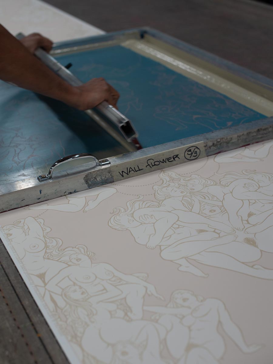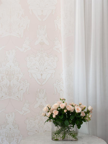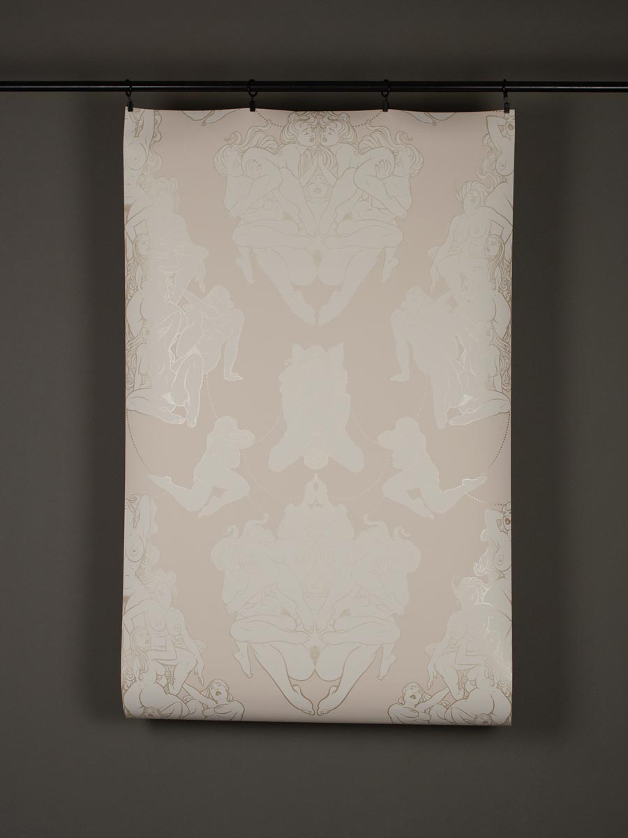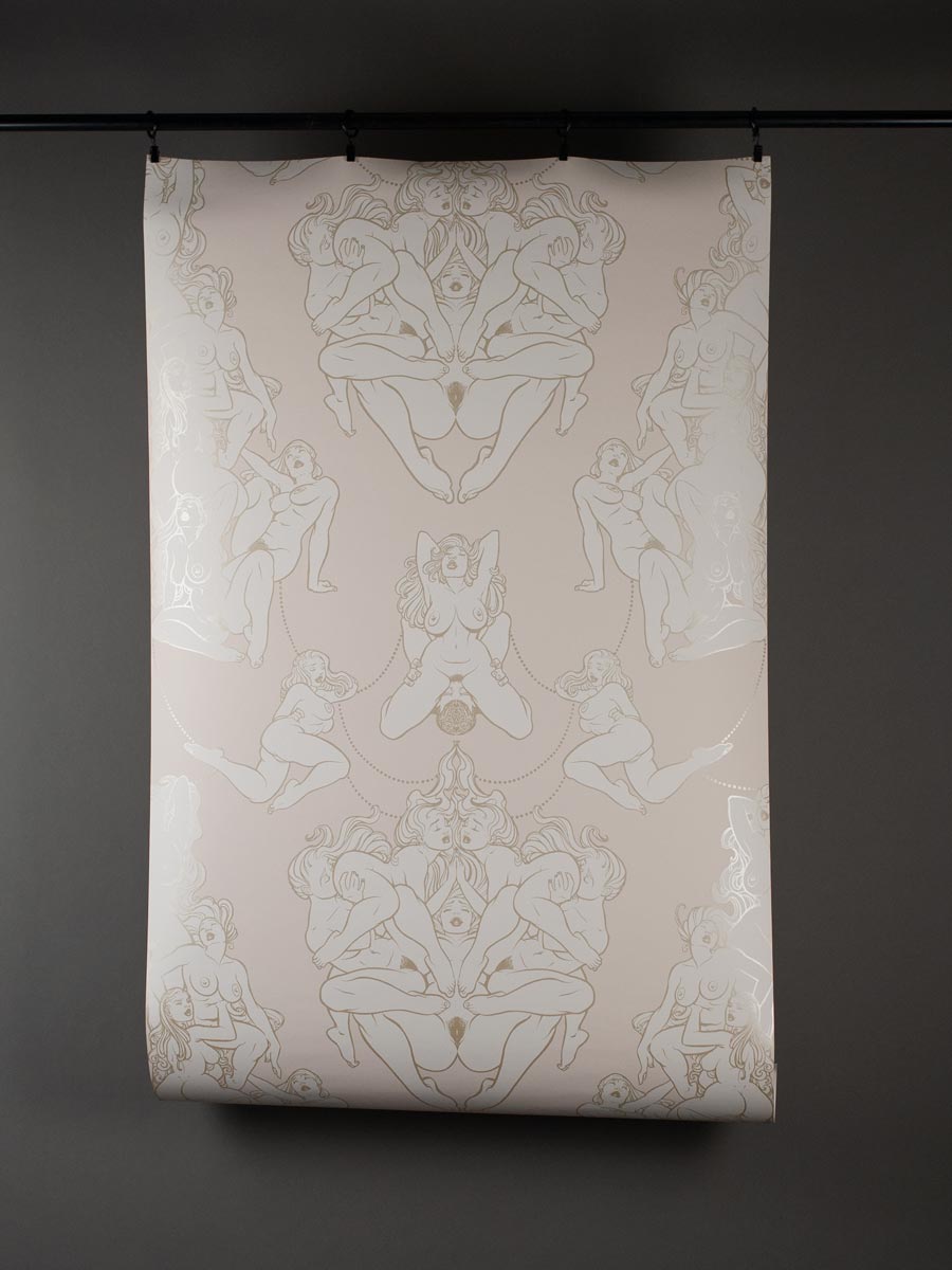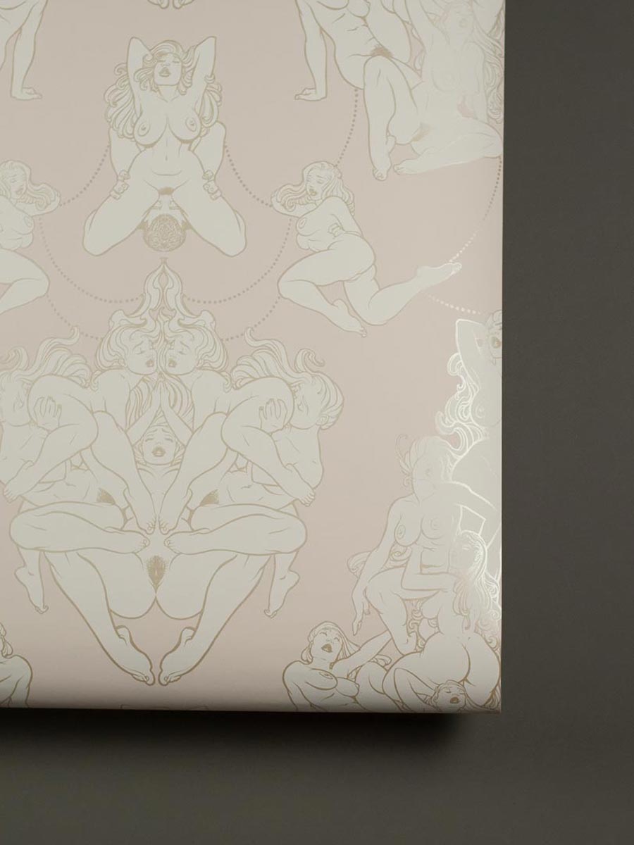 Combining the beauty of traditional baroque style wallpaper repeats, 70’s style erotica and the female form, Wallflowers by Onnie O’Leary is a celebration of sexuality, body positivity and pleasure. This erotic take on Damask design uses motifs of intertwining nudes, full of joy and sensuality, and linked strands of pearls to create a titillating, erotic design.