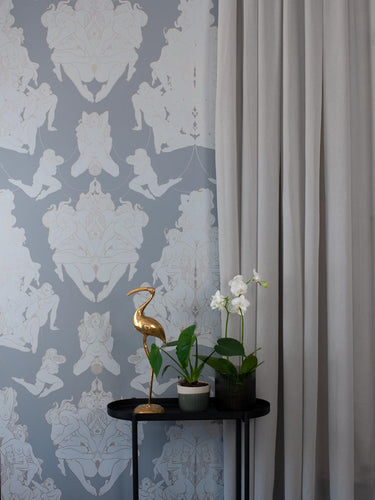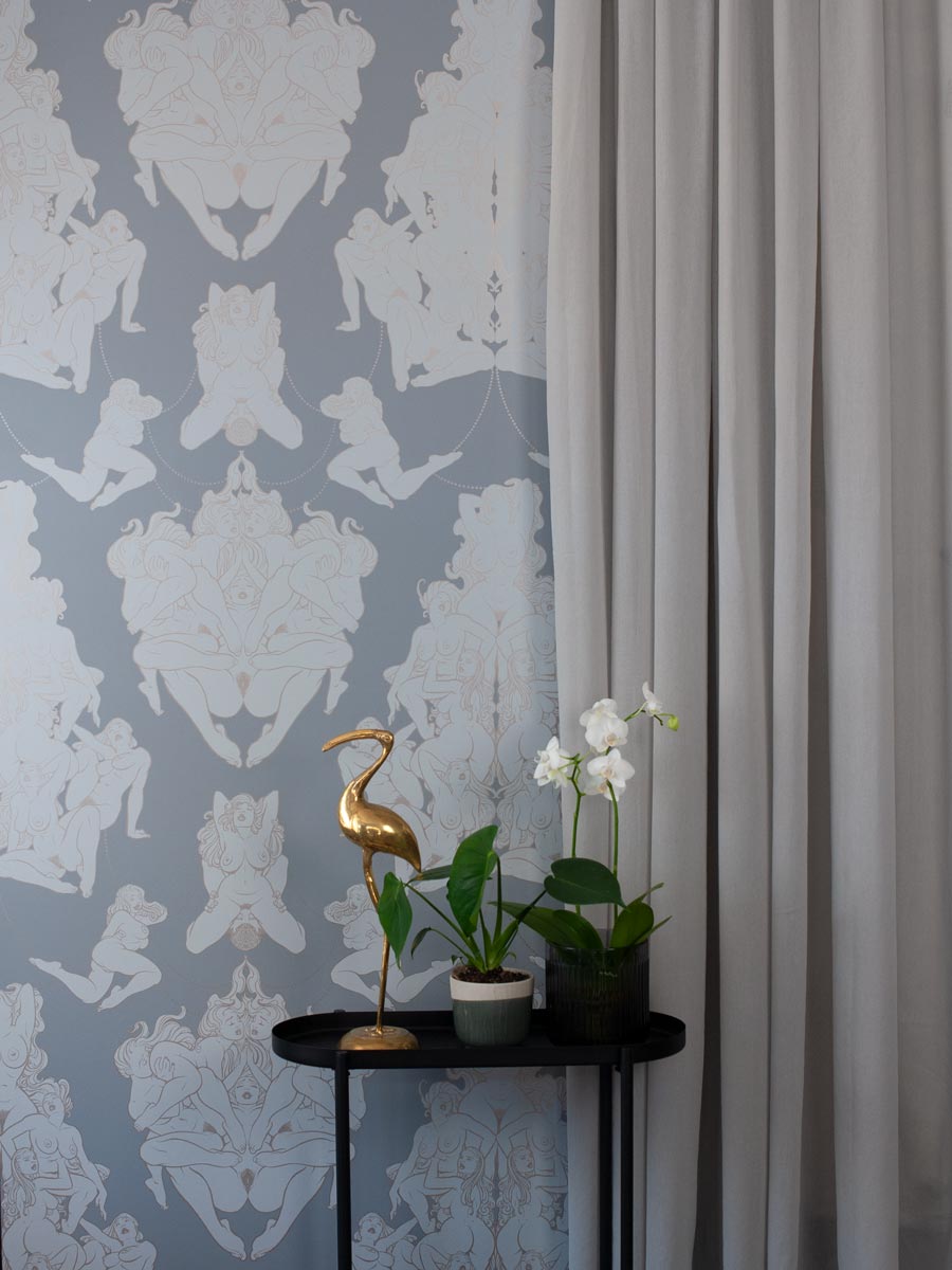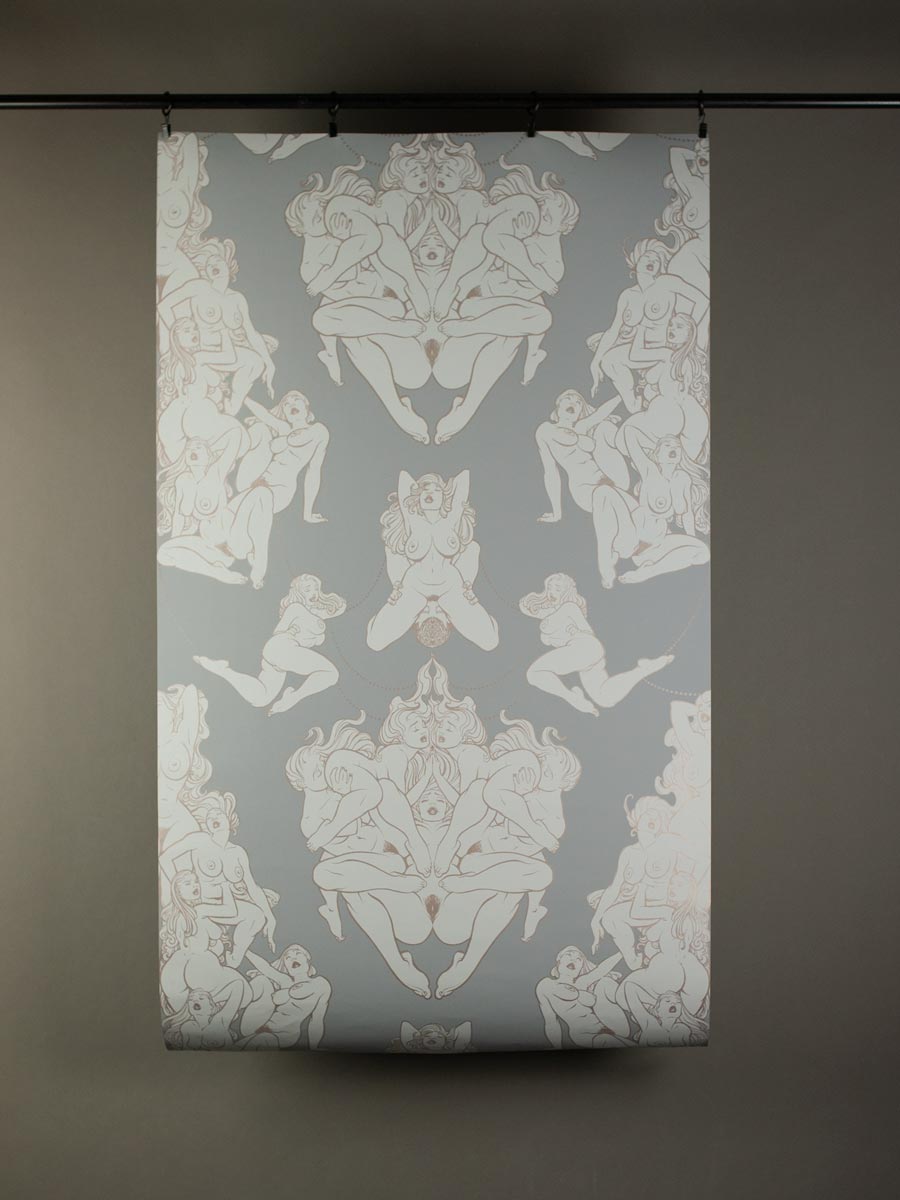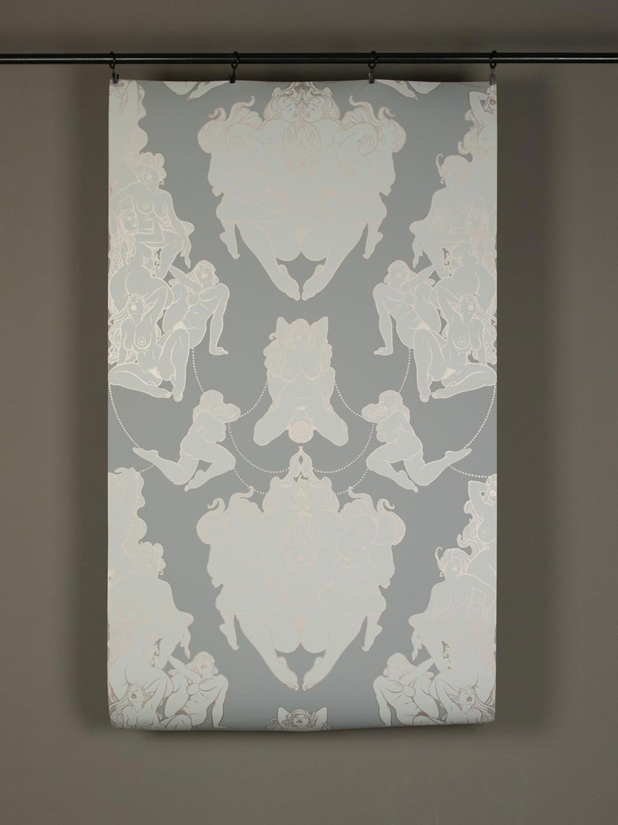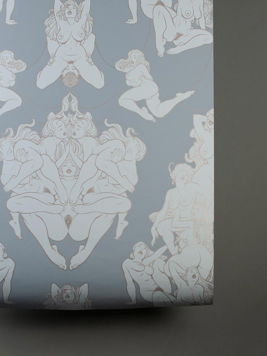 Combining the beauty of traditional baroque style wallpaper repeats, 70’s style erotica and the female form, Wallflowers by Onnie O’Leary is a celebration of sexuality, body positivity and pleasure. This erotic take on Damask design uses motifs of intertwining nudes, full of joy and sensuality, and linked strands of pearls to create a titillating, erotic design.