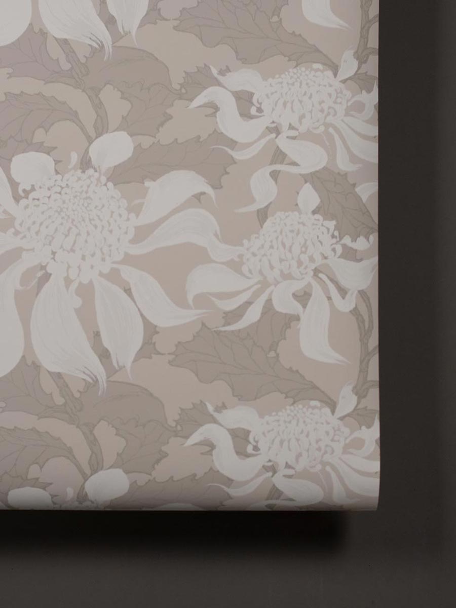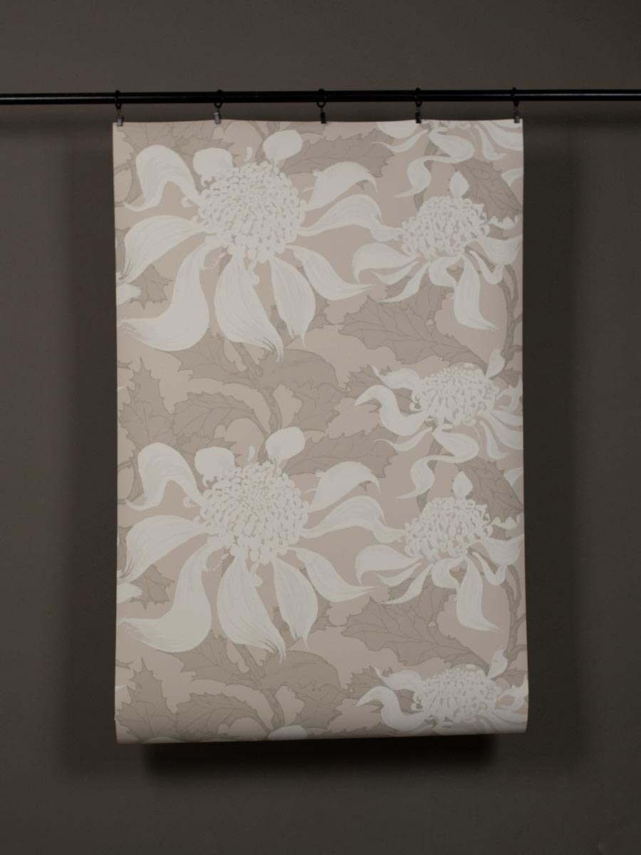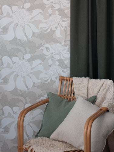 This original Australiana wallpaper was designed in house by Mark Cawood. The iconic Waratah flowers bloom with brush stroke like petals framed by their broad, serrated leaves. Printed in soft warm greys and whites as part of the C.M.G loves Publisher range, collaboration between Claire Granville and Publisher.