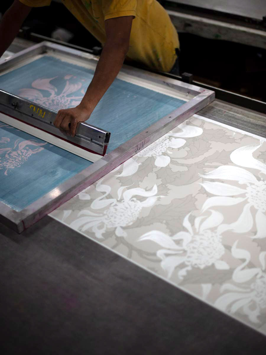 Our papers are handprinted to order using water-based, environmentally safe inks on a PVC-free, FSC-certified non-woven base. Each roll is hand trimmed and supplied ready to be hung.